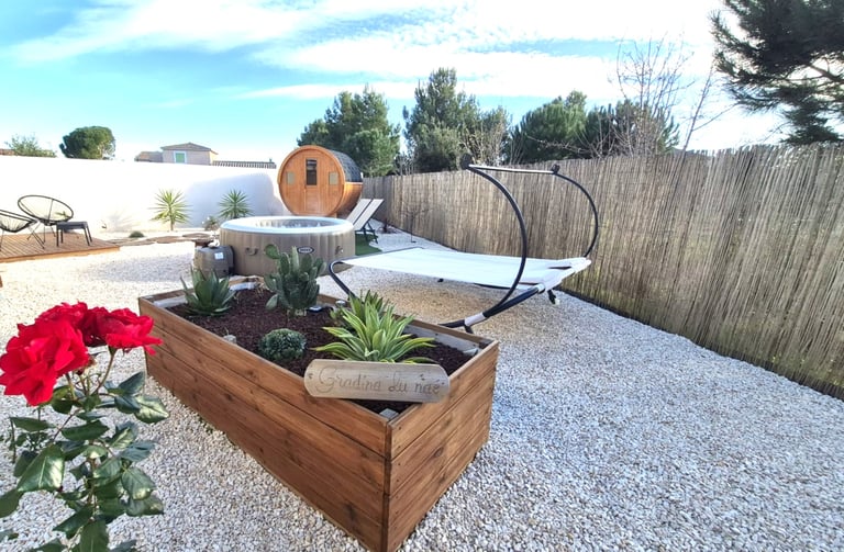 Un espace extérieur aménagé avec soin, dans une atmosphère naturelle et apaisante, propice à la détente.